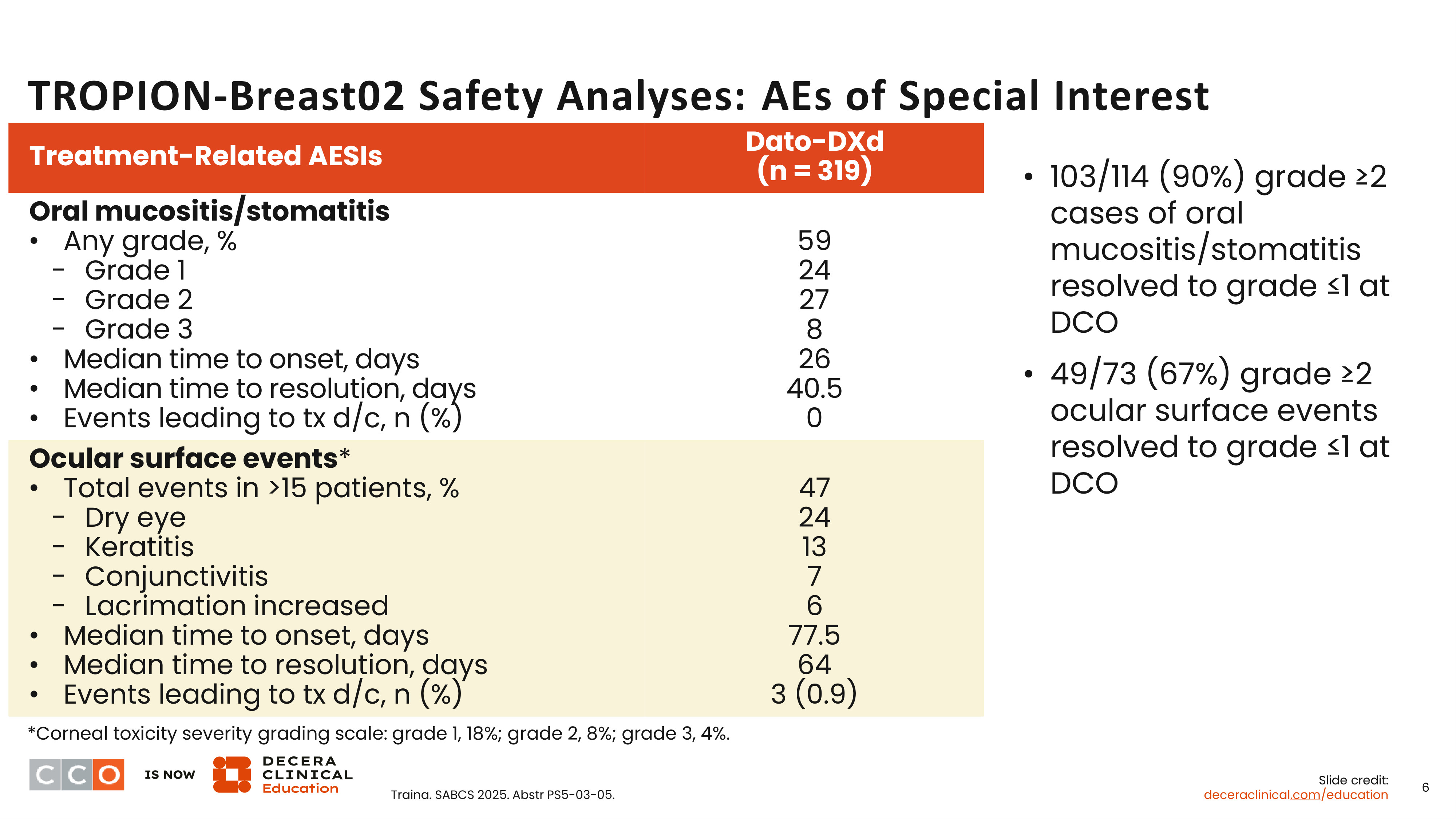 Another attendee asked whether steroids or cryotherapy were used preventively with Dato-DXd in the TROPION trials. They were not used consistently, which likely contributed to the high incidence of stomatitis. It has become clear post approval that preventive steroid mouthwash should be standard in this setting.