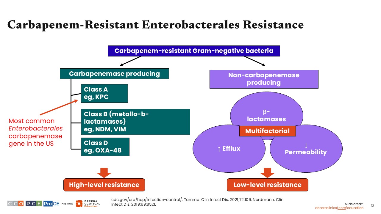 The noncarbapenemase-producing resistance phenotypes have multifactorial resistance mechanisms, based on production of other β-lactamases, increased efflux pump activity, and decreased permeability of the cell membrane to the β-lactams. Altogether, these factors generally produce lower-level resistance.9-11