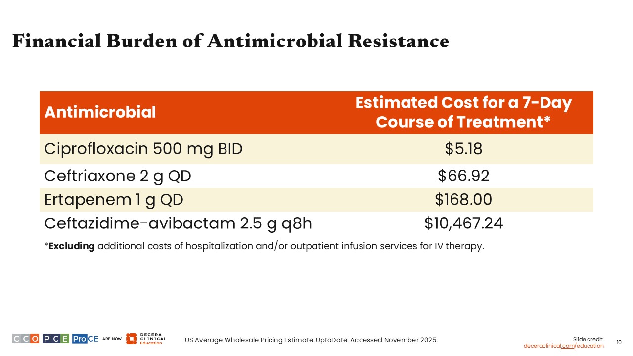Antimicrobial resistance also imposes substantial financial hardship on patients and contributes significantly to excess healthcare costs. According to average wholesale pricing of 4 different drugs used to treat cUTI in the United States, a standard 7-day treatment could cost as little as $5 or more than $10,000, depending on what drugs can be used.7