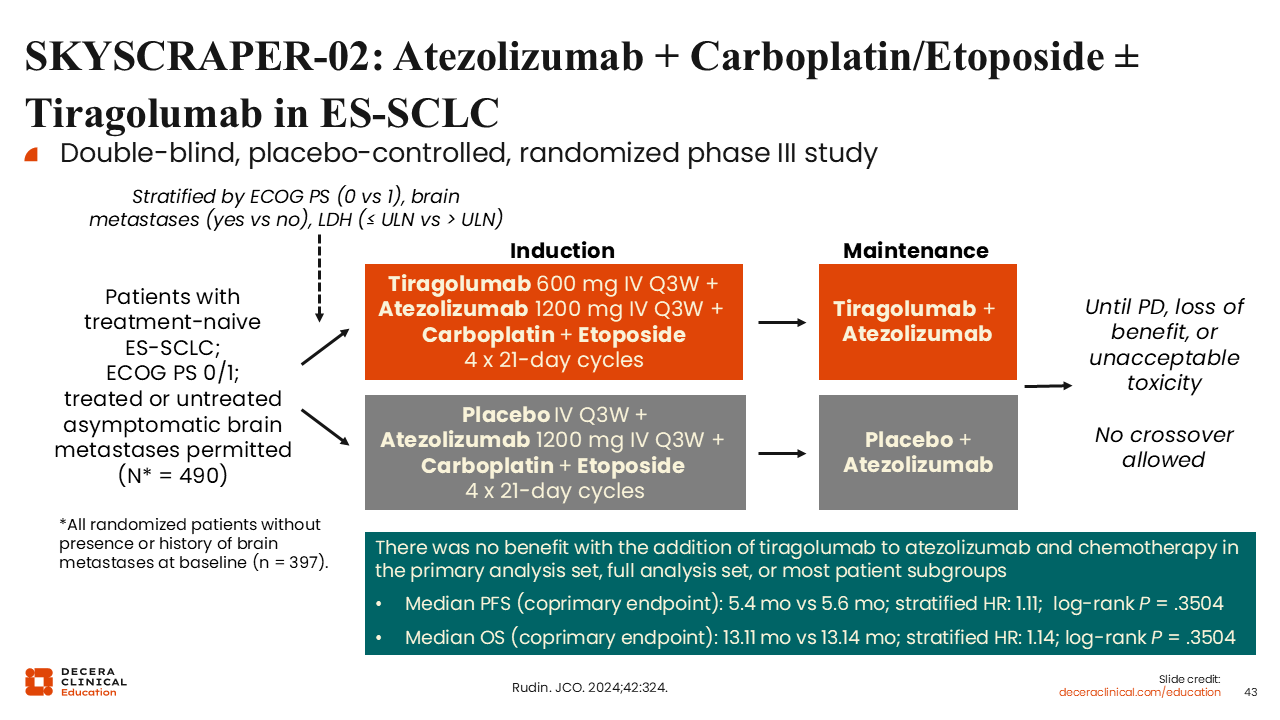 The phase III SKYSCRAPER-02 study of atezolizumab with carboplatin and etoposide, with tiragolumab or placebo in ES-SCLC failed to show a benefit in PFS or OS in the overall population and in most subgroups.39 As I discussed previously, development of tiragolumab was discontinued.
