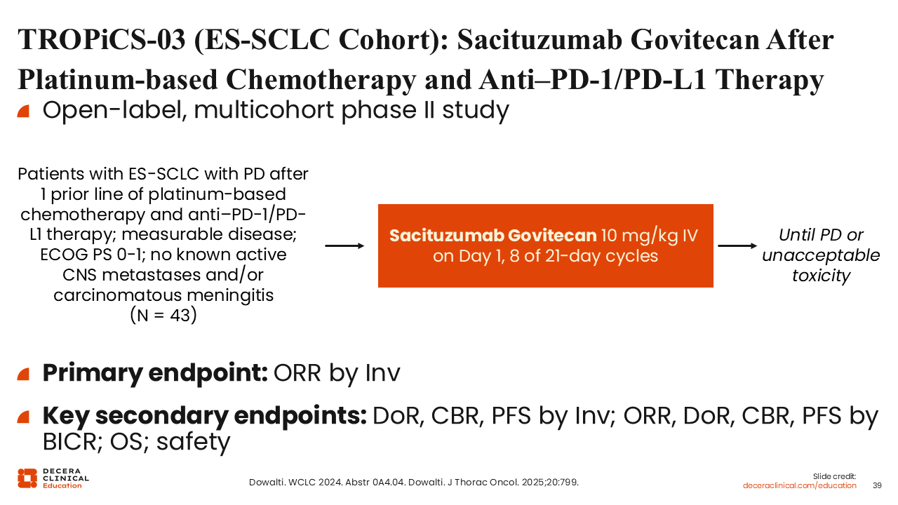 TROPiCS-03 was a single-arm phase II study of SG in ES-SCLC after 1 prior line of platinum-based CT and an anti–PD-L1 agent. The primary endpoint was ORR by investigator.37,38