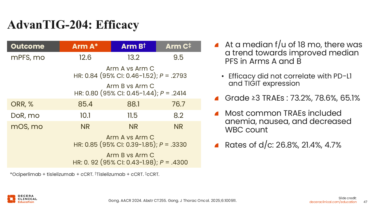 Finally, the randomized phase II AdvanTIG-204 study tested the anti-TIGIT monoclonal antibody ociperlimab with tislelizumab and concurrent chemoradiotherapy (cCRT) vs tislelizumab plus cCRT vs cCRT alone in untreated limited-stage SCLC.40,41 The 2 tislelizumab-containing arms also continued with maintenance therapy after 4 cycles of primary treatment. The study enrolled 126 patients with a primary endpoint of PFS by investigator.