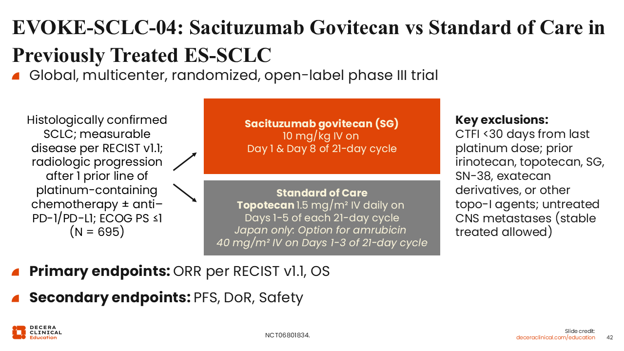 EVOKE-SCLC-04 is an ongoing phase III study randomizing patients with ES-SCLC with progression after 1 prior line of platinum-based CT with or without anti–PD-L1 therapy to SG and standard-of-care topotecan (NCT06801834).