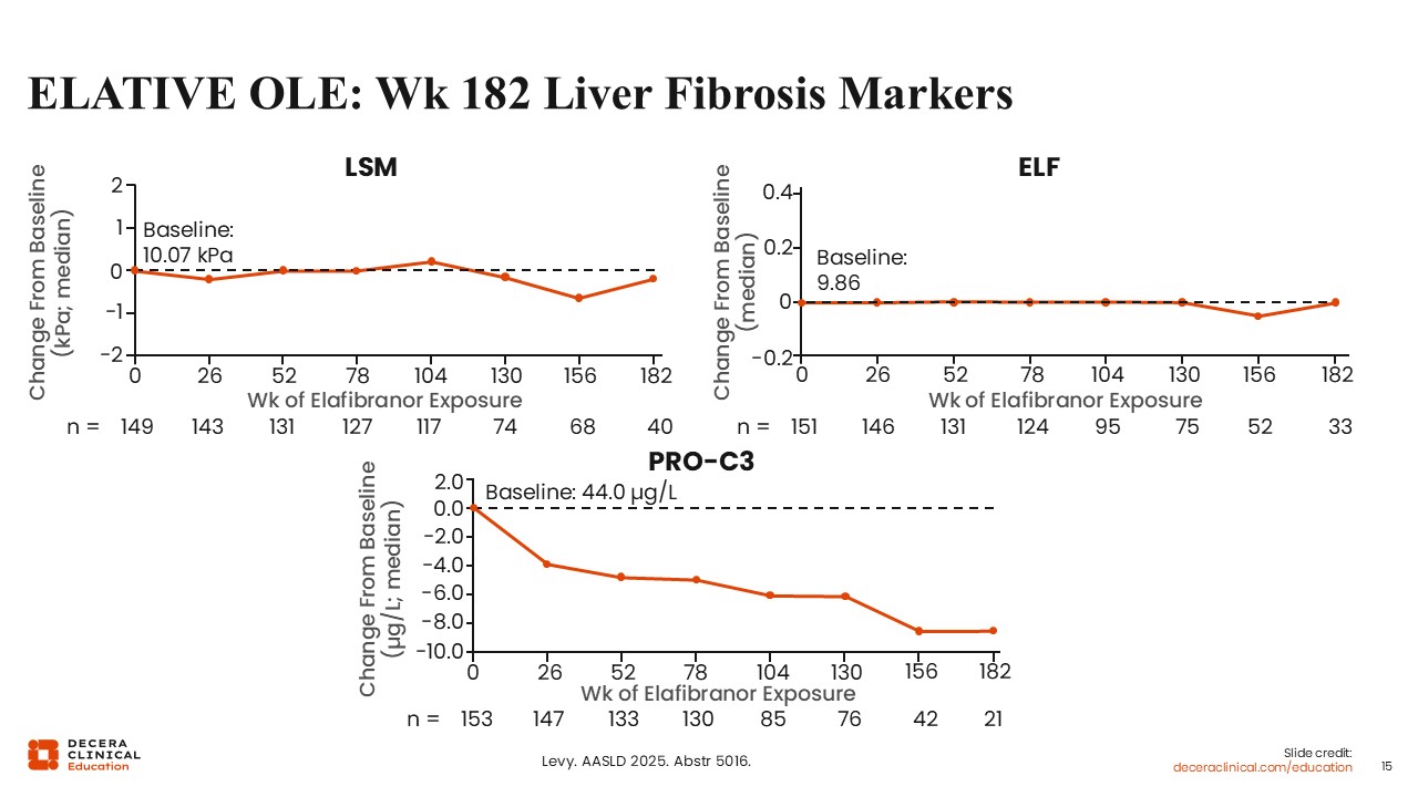 We also now have data on liver stiffness, enhanced liver fibrosis, and PRO-C3 from the elafibranor open-label extension. These markers provide additional information related to fibrosis, inflammation, and cholestasis.21