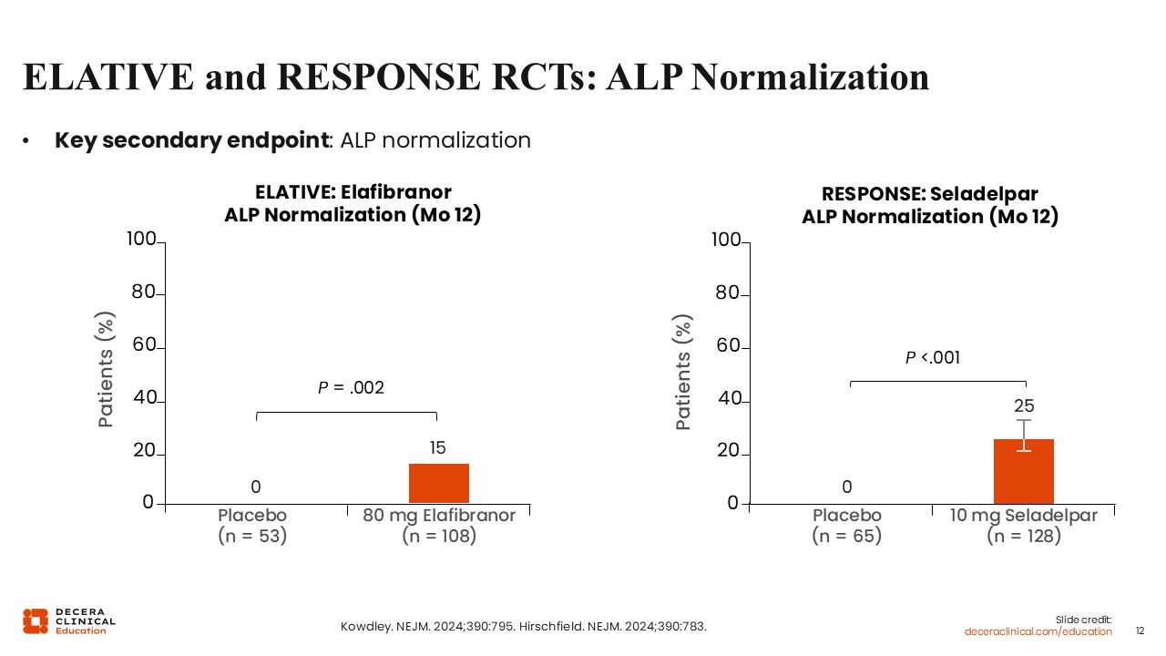 It is helpful to revisit the 2 pivotal phase III trials that supported the FDA approval of the next-generation PPAR agonists. The study populations were similar, and each trial randomized participants to a next-generation PPAR agonist or placebo over a 12-month double-blind period. In ELATIVE, they received elafibranor 80 mg, and in RESPONSE, they received seladelpar 10 mg.19,20
