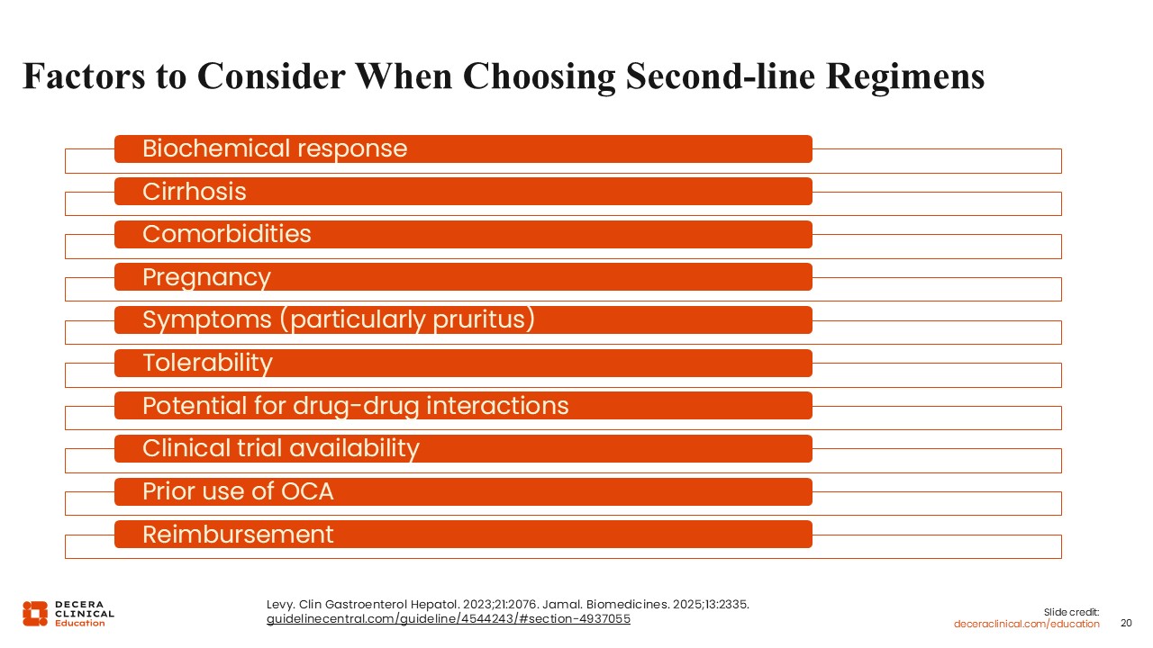 To recap, the ideal treatment goals for second-line therapy in PBC are: normalize ALP, normalize bilirubin, and resolve symptoms. With those goals in mind, treatment selection should consider the patient’s current ALP and bilirubin, the presence of cirrhosis, comorbidities, age, and symptom burden, particularly pruritus.5,25,26