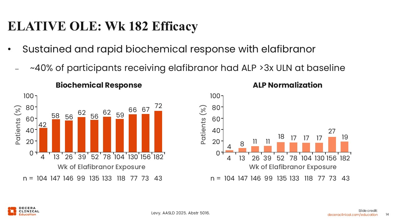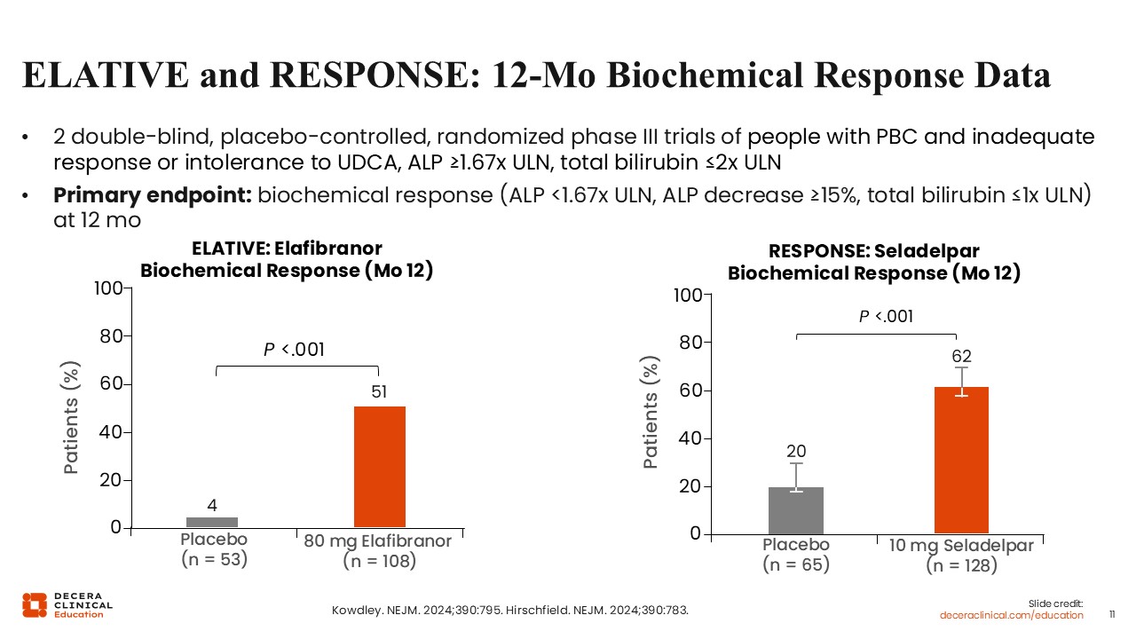 In ELATIVE, among 161 total participants, biochemical response at week 52 was observed in 51% receiving elafibranor vs 4% receiving placebo.19