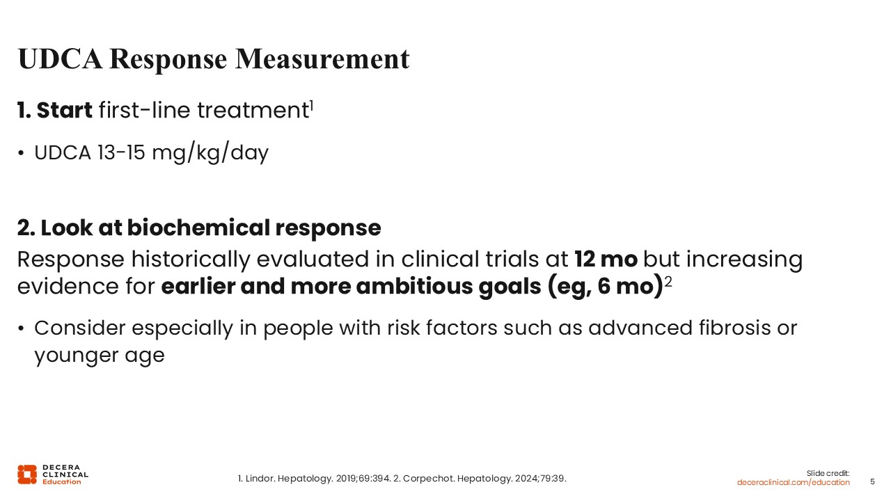 There are data showing that the classical 12-month assessment of biochemical response to UDCA can be moved forward to 6 months. This was demonstrated in a global PBC cohort study using retrospective data that initially examined ALP at 6 months rather than waiting until 12 months. The analysis showed that most people who ultimately would be classified as nonresponders at 12 months using the historic POISE criteria often could be identified earlier.11