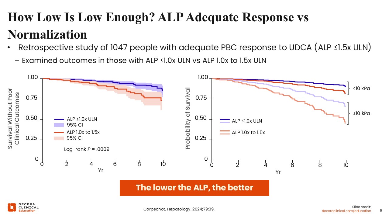 Another global PBC analysis further demonstrated that people with ALP less than the upper limit of normal have the best outcomes. When liver stiffness is added, risk can be stratified further. Even so, regardless of liver stiffness, lower ALP remains beneficial. The most favorable outcomes are seen in people with liver stiffness <10 kPa and a normal ALP.14