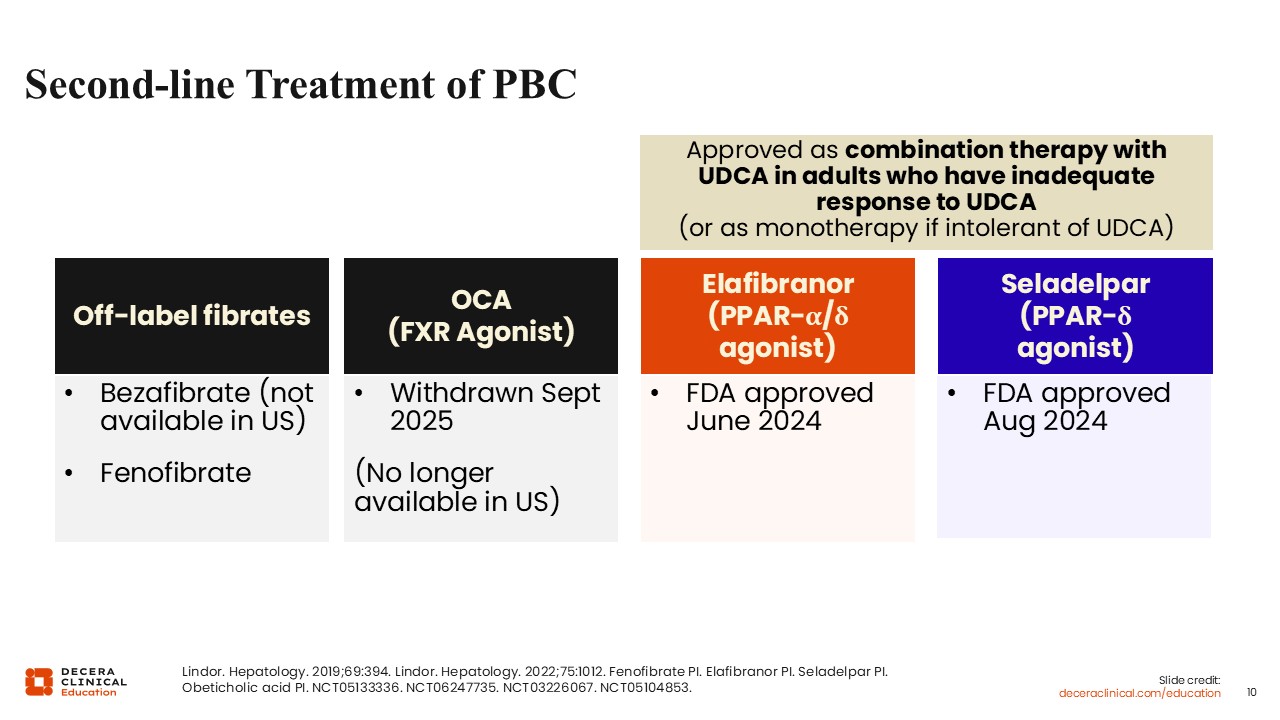 What can we do in the second-line treatment landscape for PBC? Around the world, off-label fibric acid derivatives, or fibrates, have been used for decades. Obeticholic acid was the other historical second-line treatment option, but it was withdrawn from the US market in September 2025 and is no longer available.2,12,15,16