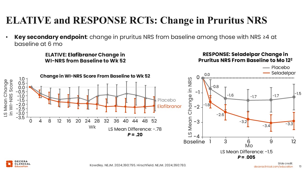 Among participants enrolled on the ELATIVE trial, the least squares mean change in worst itch from baseline did not differ significantly between elafibranor and placebo at 6 months. Among participants enrolled on the RESPONSE trial, the least squares mean change in worst itch from baseline was statistically significant with a greater reduction with seladelpar compared with placebo at 6 months.19,20
