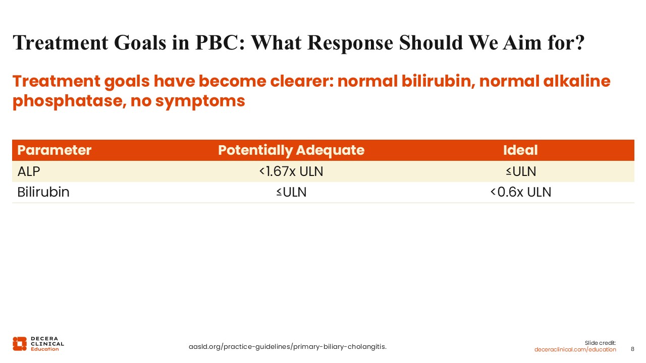 What response should we aim for when treating PBC? To keep this simple, I believe healthcare professionals should focus on 3 broad goals: normalizing bilirubin, normalizing ALP, and resolving symptoms.