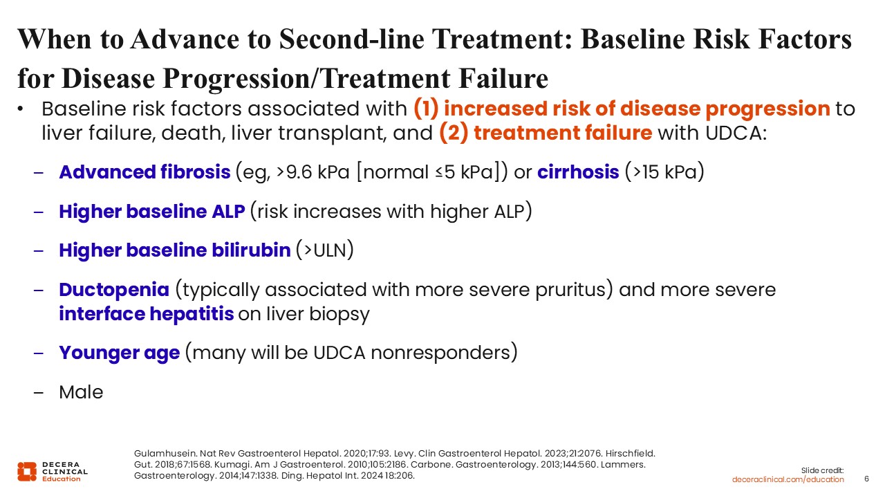 Baseline risk factors in PBC include features identified in cohort studies as being associated with increased risk of disease progression to liver failure, death, or liver transplantation, as well as a greater likelihood of treatment failure with UDCA.4-6
