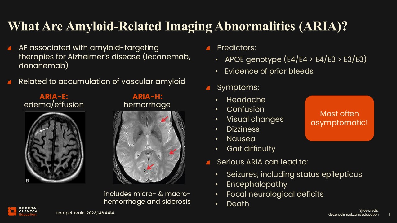 First and foremost, what are ARIA? The most important word is imaging, meaning that these are findings seen on brain MRIs in patients undergoing new treatments for AD.1