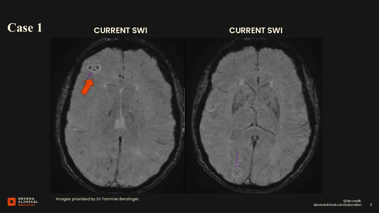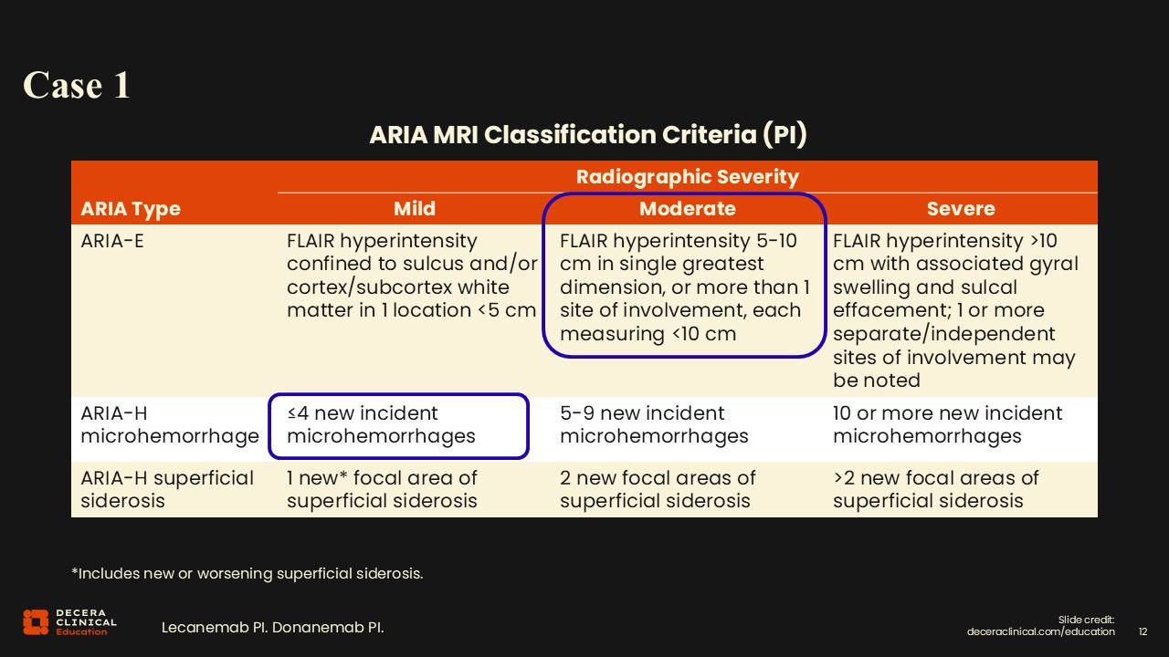 Applying the ARIA grading scale in practice is not always intuitive and can be challenging even for those who use it regularly. A radiologist’s role is to identify and quantify findings. I would recommend building some solid reporting templates so that if you click the number of microhemorrhages, the template will automatically give you the grade, so that is 1 less thing you have to keep in your mind in real time. In this case, there were 4 new microhemorrhages, so even though it might have looked concerning since they were located in 2 different parts of the brain, the ARIA-H would be classified as mild. The reverse is true for the siderosis; on FLAIR, it would be considered moderate, because even though they were small regions, 2 different regions were involved.