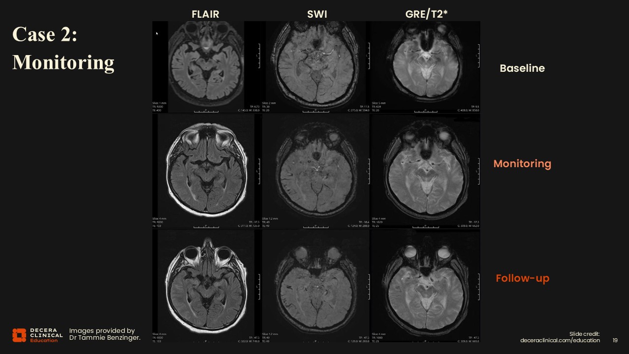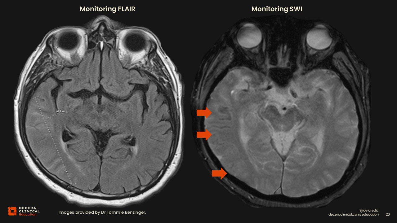 In our system, we have built out nice templates for reporting these examinations that come up automatically for us, so that if you just click 3 for siderosis, it will report severe ARIA-H.  But if the template is modified or the wrong template is loaded, then the reading radiologist will come to the wrong conclusion. This is an important operational lesson to keep in mind.
