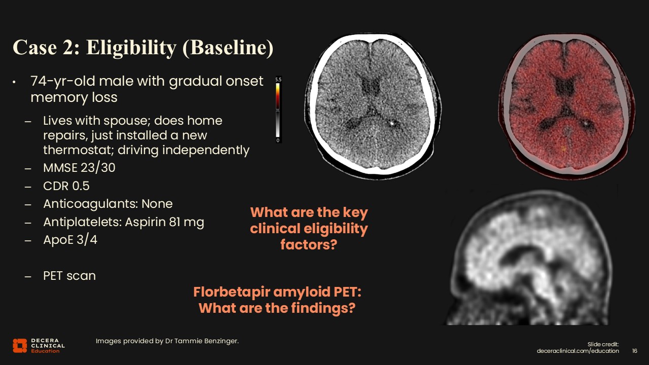 Our next case is more straightforward than the first one. This is a 74-year-old male reporting gradual-onset memory loss. He lives at home with his spouse, performs home repairs, recently installed a new thermostat, and drives independently. His MMSE was 23/30, so a bit more advanced than in the first case, but still in the reasonable range for therapy, and his CDR is 0.5. His medications do not include any anticoagulants, but he does take 81 mg of aspirin per day. He is also an APOE4 heterozygous carrier, so he has 1 APOE4 allele. He had an amyloid PET scan with florbetapir, which was positive with uptake in the cortex and sparing in the cerebellum.