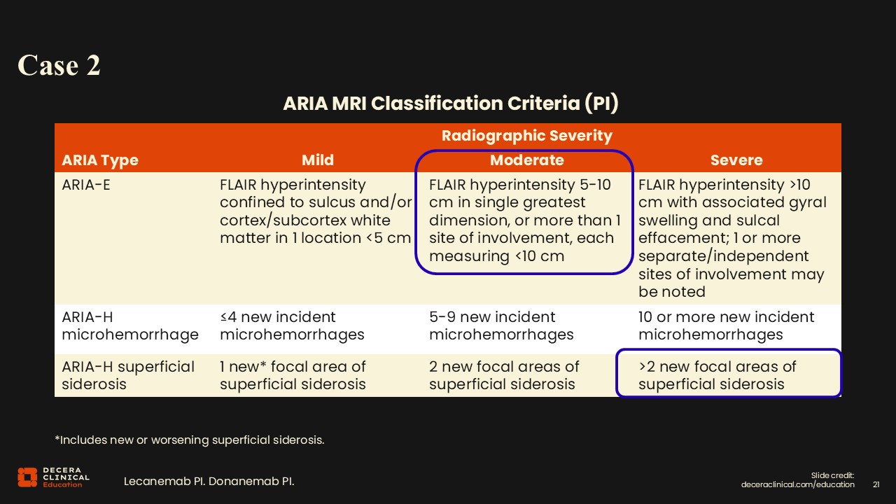 Regarding ARIA classification, we have a single region measuring over 9 cm on FLAIR, and upon careful inspection, effacement of the sulci and even some small sulcal effusions can be seen. In those same ARIA regions that have the sulcal effusions, there is a loss of signal on susceptibility, indicating a little bit of siderosis starting. The FLAIR abnormality is classified as moderate because it is less than 10 cm. However, 3 areas of siderosis place this in the severe ARIA-H category.