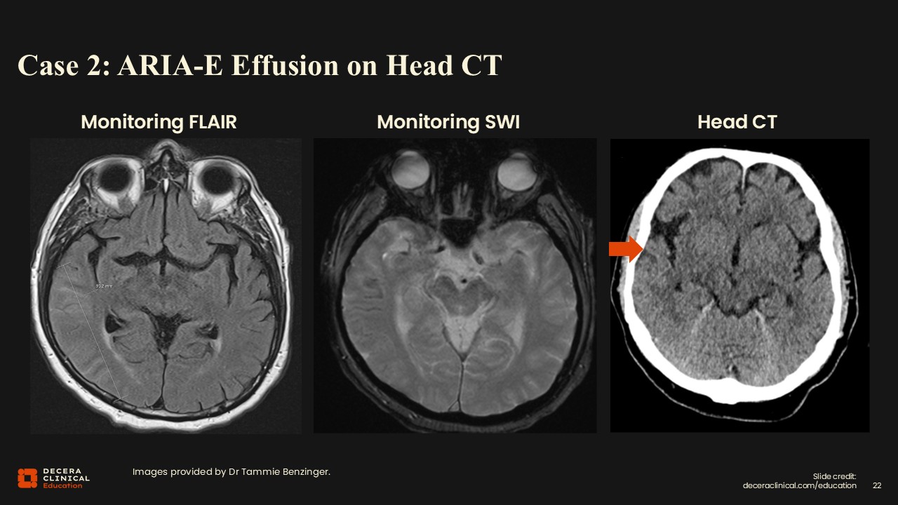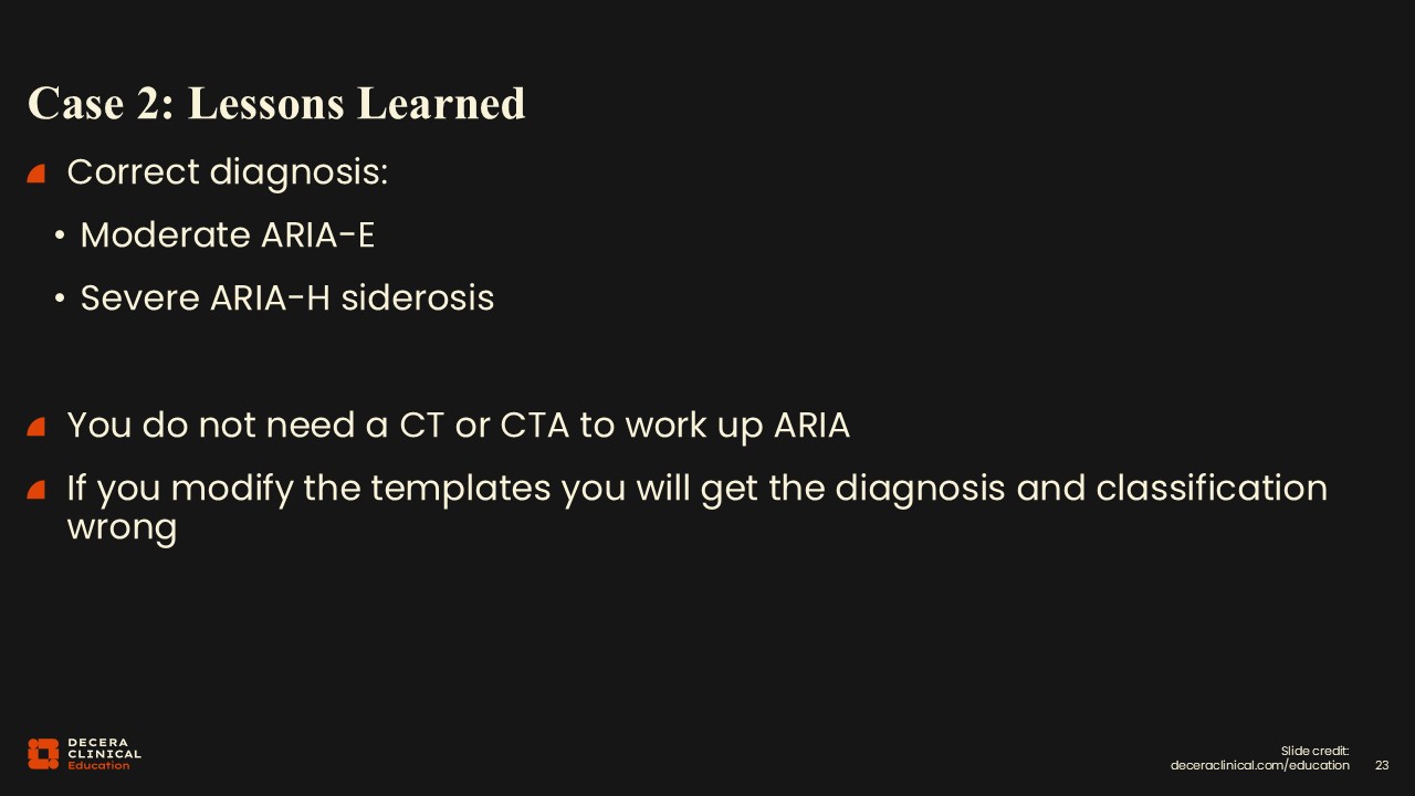 This case was initially interpreted by a radiologist less familiar with ARIA, and in fact, they saw the siderosis and sulcal effusions, and thinking this patient could have a subarachnoid hemorrhage, decided to order a head computed tomography (CT).