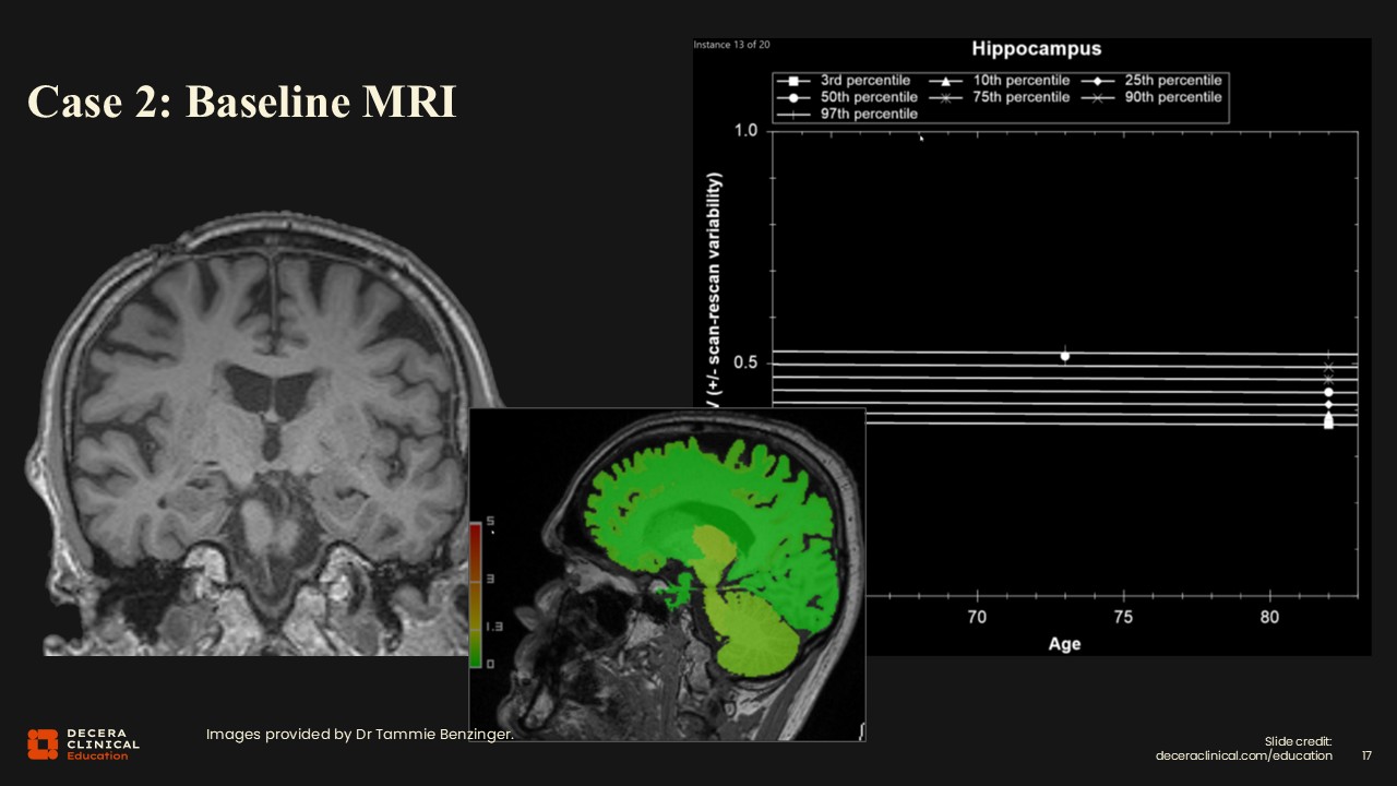 Brain volumetrics are normal, and in fact, hippocampal volumes are actually better than normal with no atrophy.
