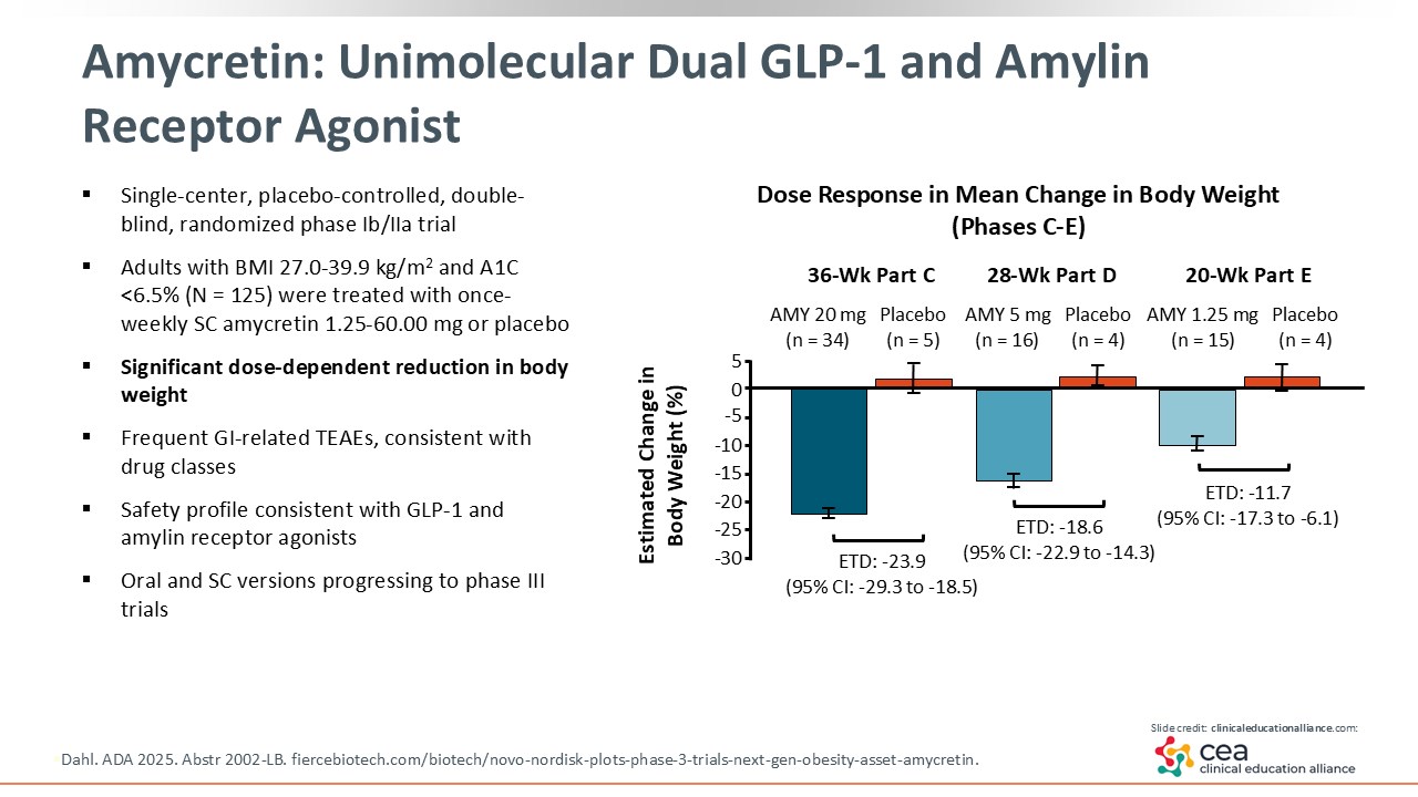 A single-center, double-blind, randomized phase Ib/IIa trial enrolled adults with BMI 27.0-39.9 kg/m2 and A1C <6.5% and treated them with once-weekly, subcutaneous amycretin vs placebo. At 36 weeks, the estimated treatment difference in weight loss was more than -20% with amycretin vs placebo. So this is a another potent AOM, particularly when compared with placebo. Finally, the safety profile of amycretin was similar to what we have seen in this drug class.43