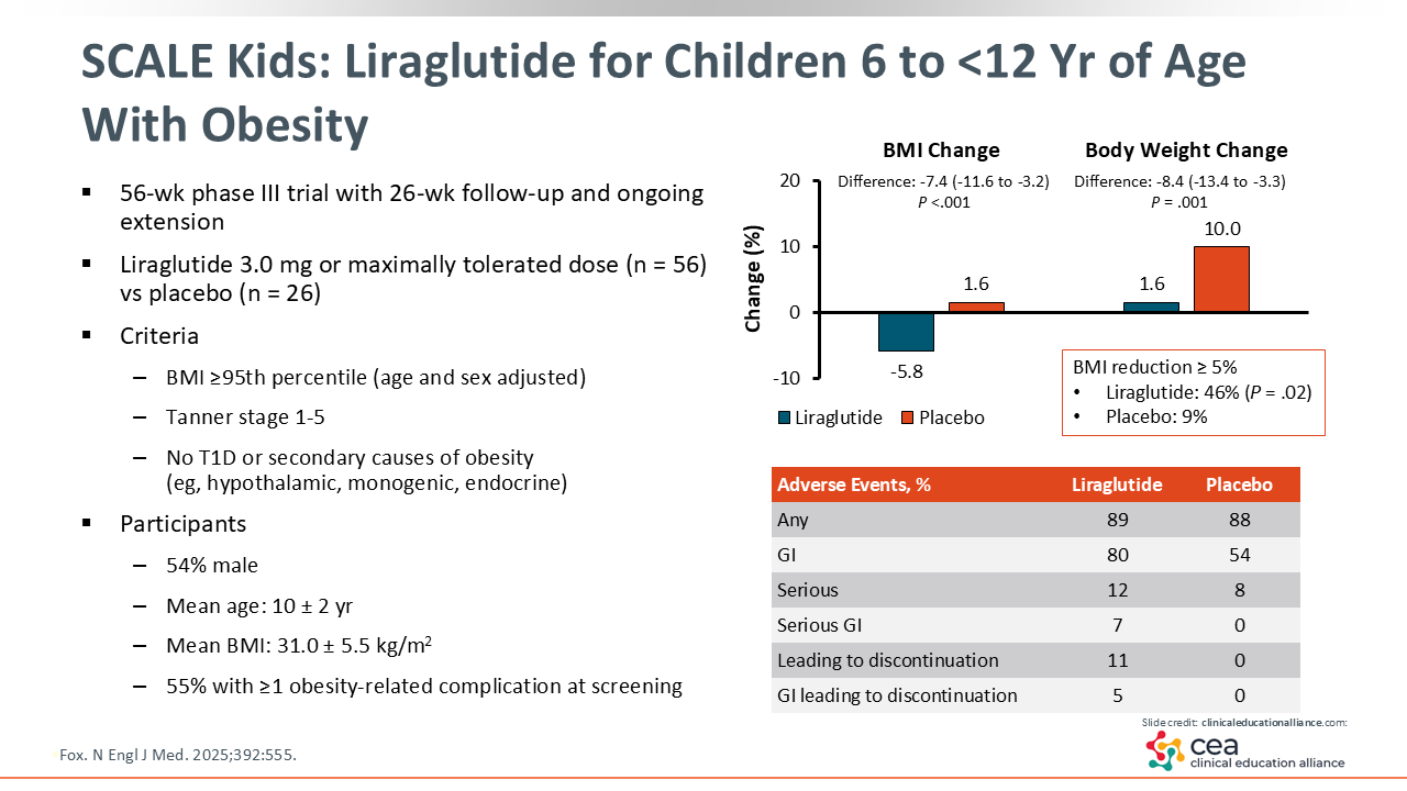 Highlighting one study in younger children, the SCALE Kids trial looked at liraglutide in children aged 6 to less than 12 years with obesity. It is important to recognize that children with obesity at 6 years of age have a very high likelihood of having obesity for life.