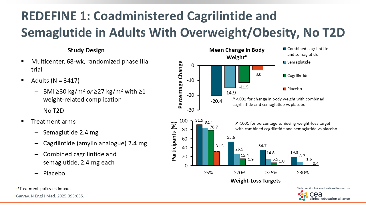 In the REDEFINE 1 trial, cagrilintide and semaglutide were coadministered and compared with cagrilintide alone, semaglutide alone, and placebo in adults with overweight or obesity. This was a multicenter, randomized phase III trial that enrolled adults with BMI ≥30 kg/m2 or adults with BMI ≥27 mg/k2 and ≥1 weight-related complication. Of note, both cagrilintide and semaglutide independently are beneficial, and they may have a synergistic effect when used together.