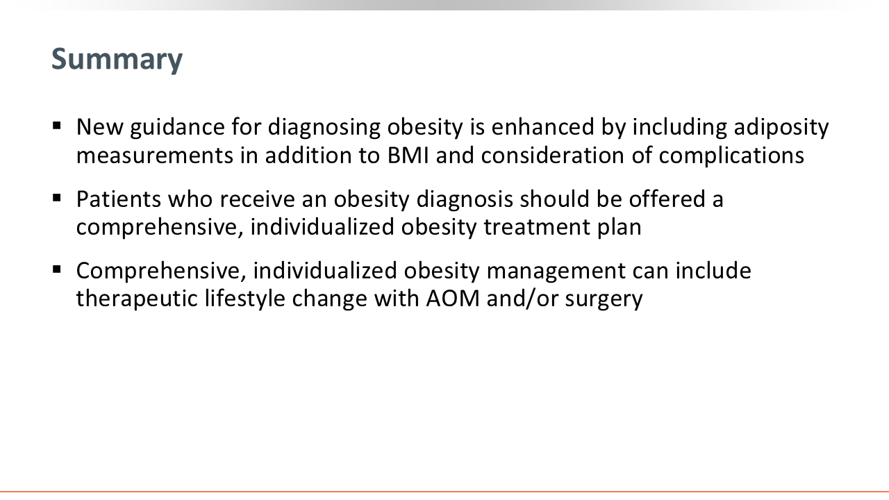 Today is a new day in the world of managing obesity. There is enhanced guidance for diagnosing obesity that goes far beyond the use of BMI alone, including anthropomorphic and direct body fat measurements. Furthermore, this updated guidance should help HCPs identify preclinical and clinical obesity, and HCPs should offer all patients a comprehensive treatment plan to address obesity. This includes lifestyle modifications, pharmacotherapy, and surgical approaches. Every patient deserves to have an individualized treatment plan. Being prepared to use all the tools, including new therapies as they become available, will provide the best chance for patients with obesity to achieve their optimal health.
