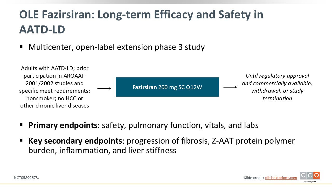 There is an open-label extension study for fazirsiran, which is a multicenter phase III trial. Adults with AATD-related liver disease and prior participation in AROAAT-2001/2002 studies who met specific requirements were nonsmokers and did not have HCC or other chronic liver diseases. They started on fazirsiran 200 mg subcutaneously administered every 12 weeks and will continue treatment until regulatory approval and commercial availability, withdrawal, or study termination.