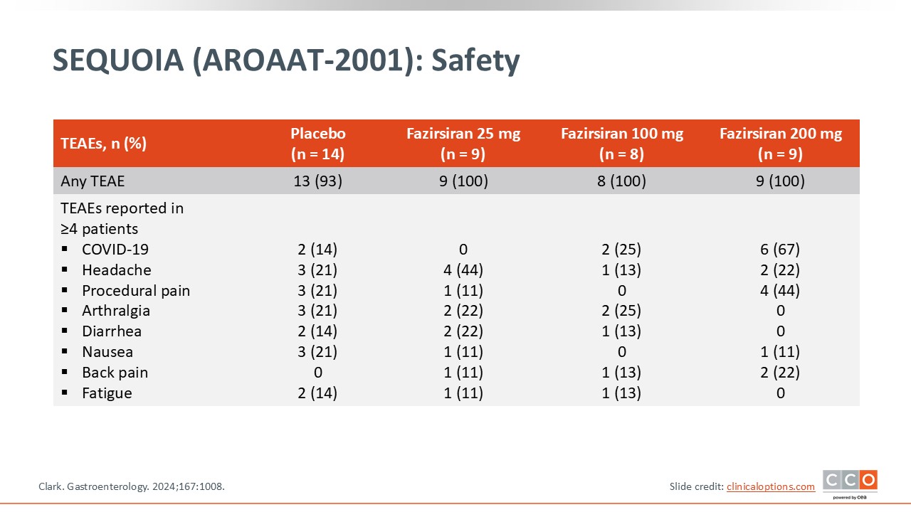 Treatment-related AEs in the SEQUOIA trial are listed here. There were 5 reported serious AEs: 2 patients in the fazirsiran 200 mg arm and 3 patients in the placebo arm. The 2 serious AEs in the fazirsiran 200 mg arm comprised 2 patients receiving AATD augmentation therapy with pre-existing pulmonary disease who had infective exacerbations of bronchiectasis. The 3 serious AEs in the placebo arm included 1 patient with influenza, acute pancreatitis, and staphylococcal wound infection; 1 patient receiving AATD augmentation therapy had hypertensive crisis and decreased pulmonary function test; and 1 patient with presyncope. No AEs resulted in discontinuation, dose interruption, study withdrawal, or death.45