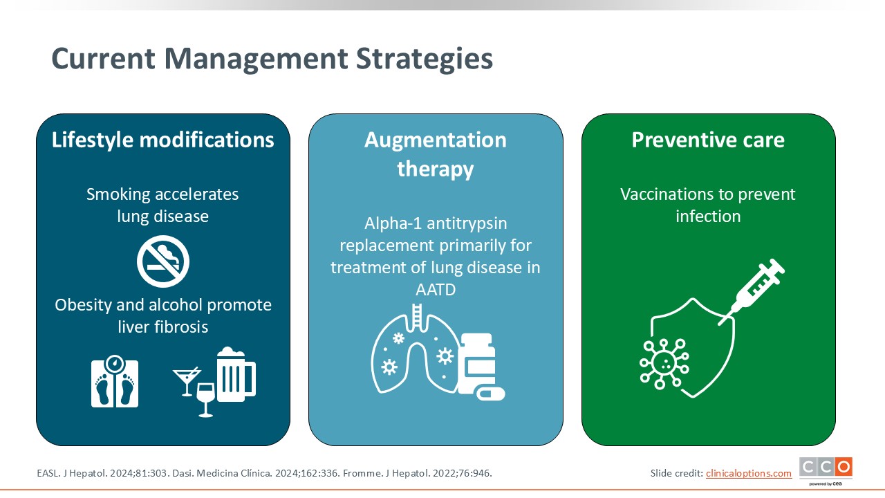 Current AATD management strategies include lifestyle modifications. For example, smoking accelerates lung disease so patients should be directed to stop smoking. Obesity and alcohol promote liver fibrosis, so maintaining a healthy body weight and avoiding alcohol is recommended.