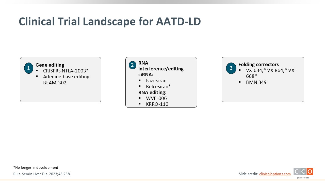 In the clinical trial landscape for AATD-related liver disease, we have some gene editing approaches that are currently in play. NTLA-2003 uses CRISPR technology (no longer in development) and BEAM-302 uses adenine base editing. There are RNA interference and editing small interfering RNA (siRNA) therapies like fazirsiran in development. In addition, RNA editing with WVE-006 and KRRO-110 is being studied. Then there are fold correctors, such as BMN 349. So there is a lot of activity in new drug development across a spectrum of genetic platforms, folding correctors, and small molecules.41
