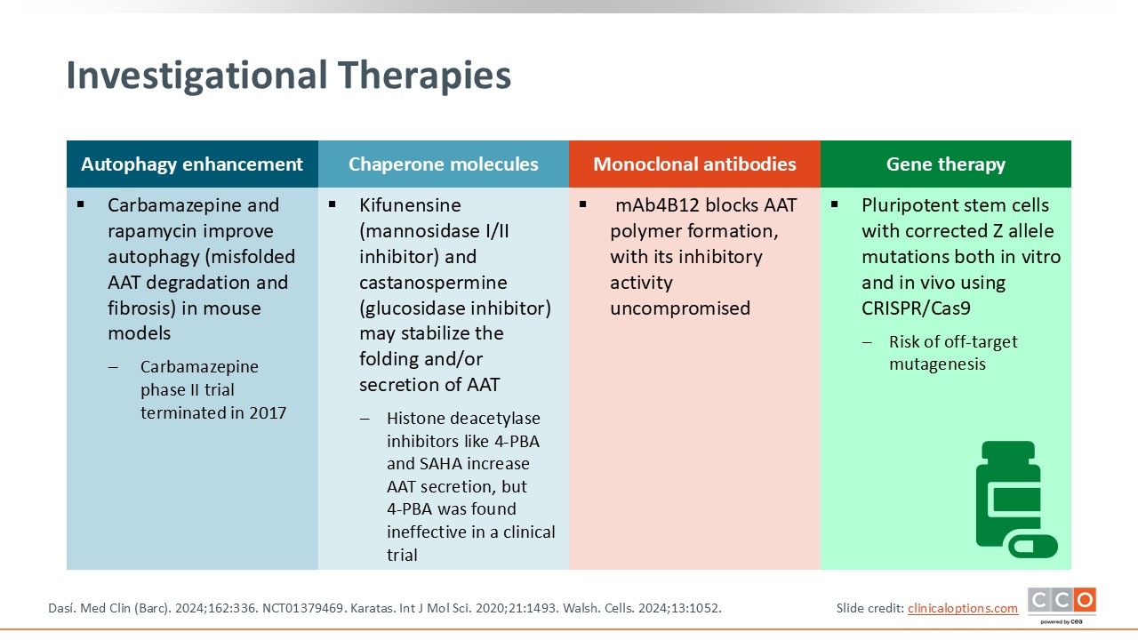 There are other investigational therapies. Autophagy enhancements with investigational agents (carbamazepine and rapamycin) may improve misfolded AAT degradation and fibrosis in mouse models, but carbamazepine’s phase II trial was terminated in 2017. Chaperone molecules like kifunensine (a mannosidase I/II inhibitor) and castanospermine (a glucosidase inhibitor) may stabilize the folding and/or secretion of AAT. Then histone deacetylase inhibitors like 4-phenylbutyric acid 4-PBA and suberoylanilide hydroxamic acid were found to increase AAT secretion, but 4-phenylbutyric acid was determined to be ineffective in a previous clinical trial.
