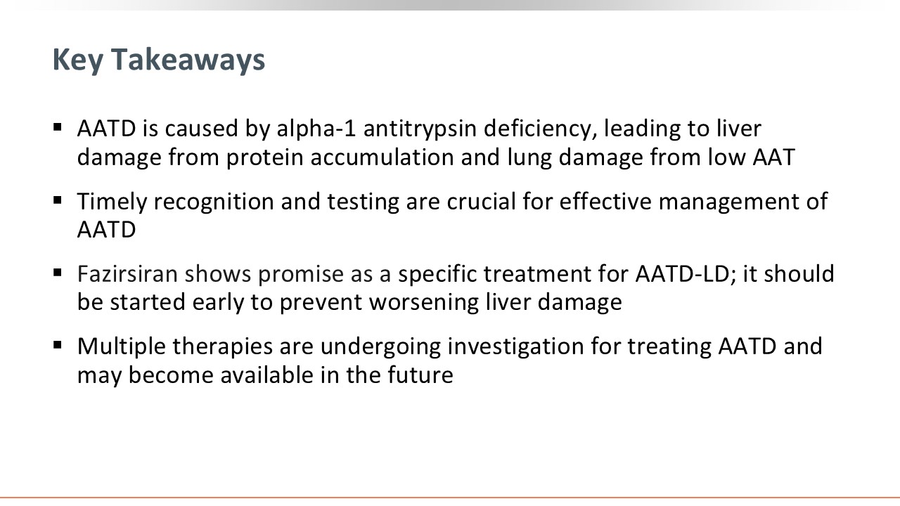 AATD is caused by deficiency in the AAT protein, leading to liver damage because of protein accumulation and lung damage related to low AAT levels. Timely recognition and testing are crucial for effective AATD management. Fazirsiran shows promise as a specific treatment for AATD-related liver disease, and additional studies are needed before its clinical use and FDA assessment. Furthermore, multiple therapies are undergoing investigation for treating AATD and may receive FDA approval in the future.