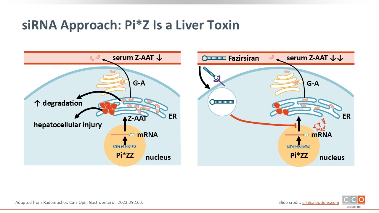 When using an siRNA like fazirsiran, the transcription of the Pi*ZZ gene is blocked, leading to the reduced formation of the mutant Z-AAT protein. It is not formed because that gene is silenced, and the protein that exists in the liver can degrade gradually, improving liver disease homeostasis over time because there is less Z protein accumulation.42