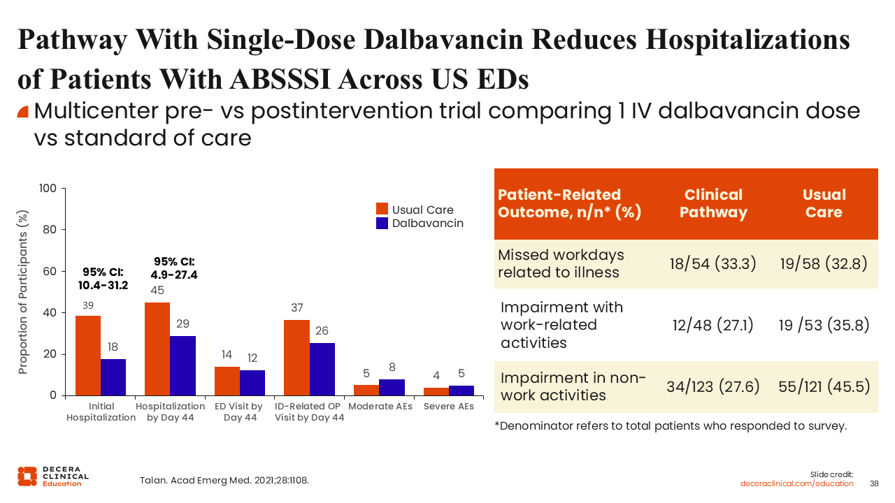 Investigators reported a reduction in initial hospitalizations from 39% with standard-of-care therapy to 18% with dalbavancin. Of importance, there was no increase in subsequent hospitalizations through Day 44, ED visits through Day 44, or infection-related outpatient visits, despite administration of a single-dose regimen.64