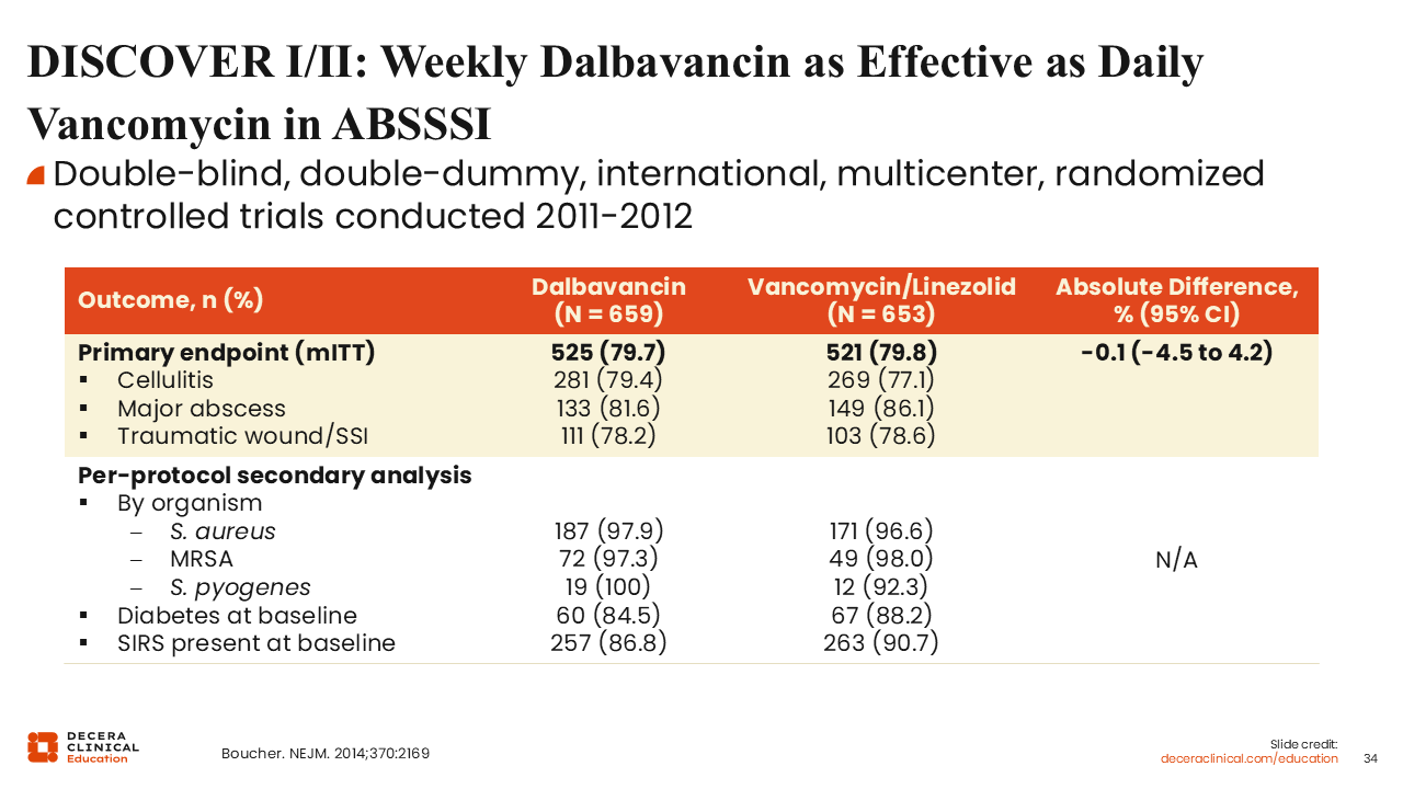 The DISCOVER-I and II trials compared dalbavancin with vancomycin followed by linezolid therapy. Based on the types of infections—cellulitis, major abscesses, and wound infections—and broken down by pathogen, dalbavancin proved to be noninferior to vancomycin.59