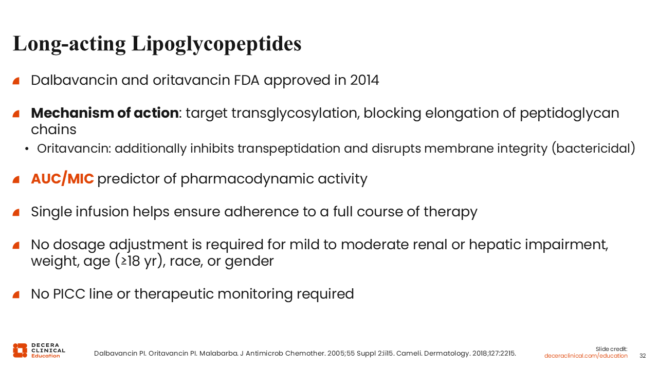 The long-acting lipoglycopeptides, dalbavancin and oritavancin, disrupt peptidoglycan, similar to vancomycin’s method of action. Oritavancin also has some transpeptidation activity and membrane disruption. It is more bactericidal, at least in the laboratory.55,56