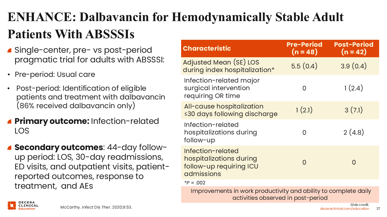 Implementation of dalbavancin was associated with a significant reduction in mean hospital length of stay compared with standard-of-care therapy. Of importance, there were no statistically significant differences in infection-related readmissions or other adverse outcomes, although there was a numerically higher rate of all-cause readmissions that did not reach statistical significance in the dalbavancin group.63