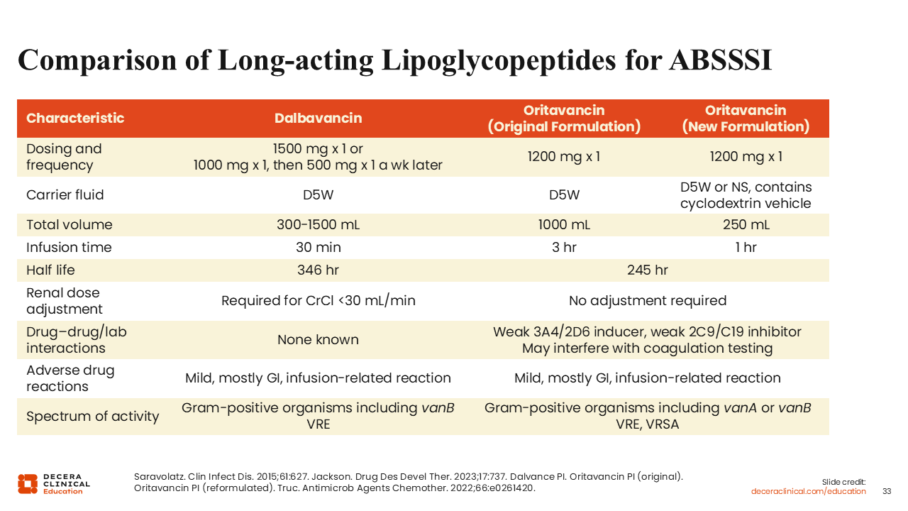 The original formulation of oritavancin was a 3-hour infusion, which was restrictive for a lot of infusion centers. When both of these came to market at the same time, I think there was a predominance toward dalbavancin because the logistics of a 30-minute infusion were more feasible than a 3-hour infusion.55-58