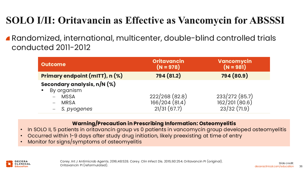 Similarly, the SOLO trials examined oritavancin vs vancomycin for the treatment of ABSSSI and resulted in FDA approval for oritavancin for ABSSSI in 2014.56,61,62