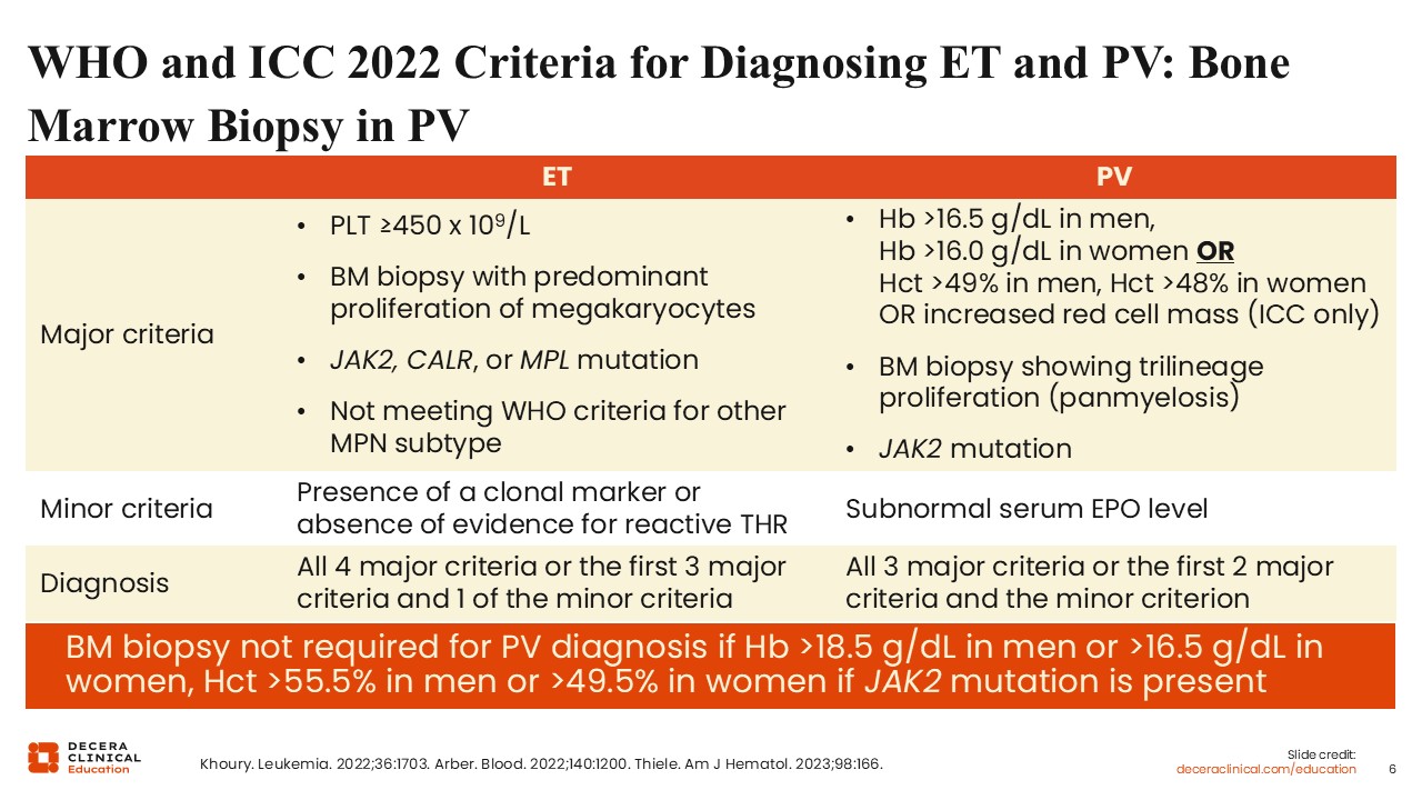 Of note, the WHO and ICC criteria do not require a bone marrow biopsy for PV diagnosis if a patient has sustained erythrocytosis, a JAK2 mutation, and if they also have a subnormal erythropoietin level.2,8-10 In practice, a diagnostic bone marrow biopsy can still be helpful for establishing a baseline and providing some prognostic information, particularly in younger patients who are at risk of having progression occur in their lifetime.