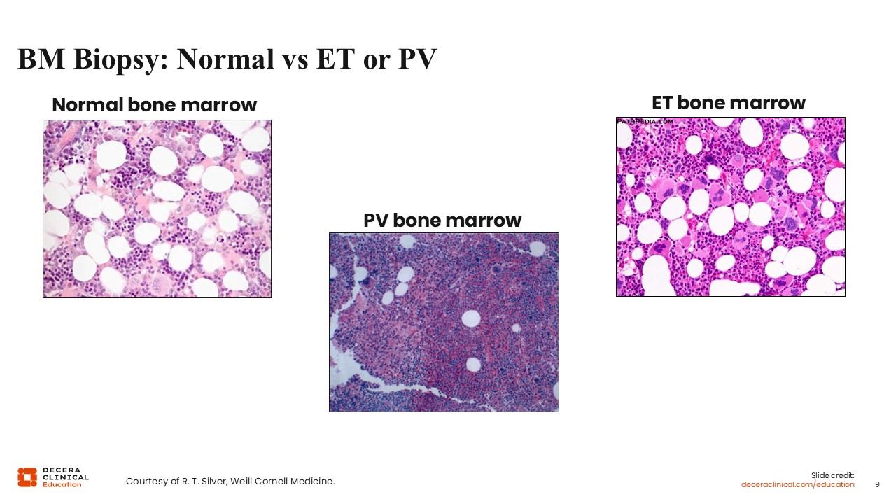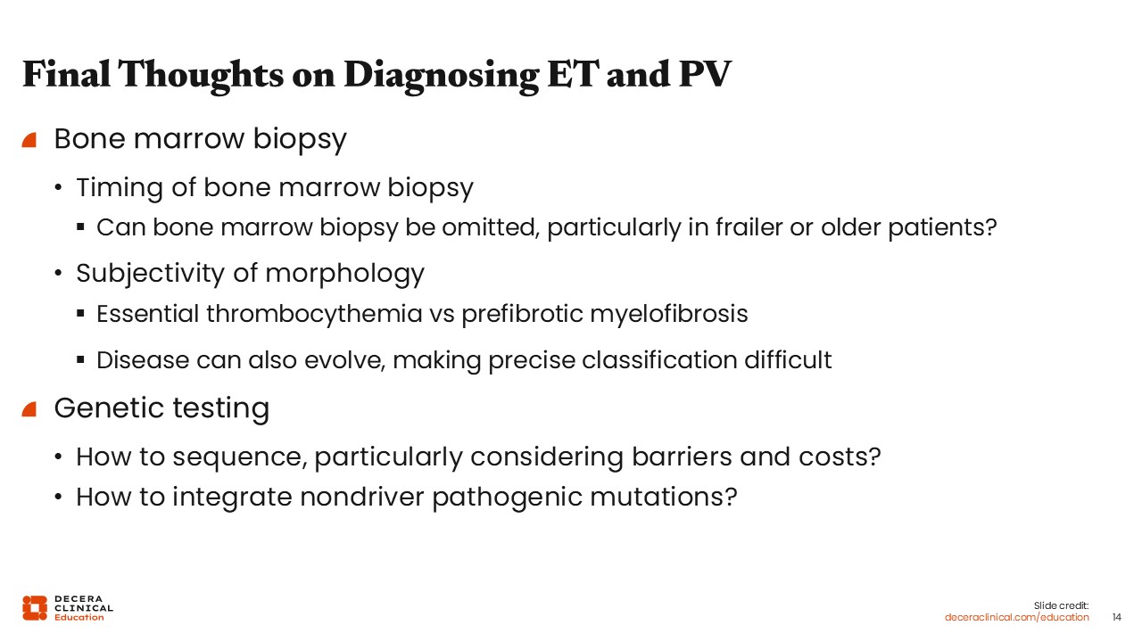 In conclusion, diagnosis of ET and PV requires patients to meet criteria for elevated blood counts and to have characteristic bone marrow biopsies.1-3 By formal criteria, a bone marrow biopsy is required for ET diagnosis but not necessary for PV diagnosis, although a diagnostic bone marrow biopsy is still helpful for prognosis and establishing a baseline of disease.2,3, Most often, however, the results of the bone marrow biopsy will not change management, so you could consider omission in patients who would not tolerate the procedure well. Diagnosis can be complicated by the fact that the MPNs lie on a spectrum, making precise classification difficult. Morphology is key, particularly for distinguishing ET from prefibrotic MF, but can have subtle findings and really requires a good pathologist to make a call. Genetic testing is also crucial for ET and PV, but unlike in MF, the value of sequencing beyond the driver mutations is less clear. How you perform molecular tests—including whether you do sequential, reflex, or concomitant testing—depends on cost, testing availability, and clinical urgency. Ongoing clinical research is needed to further refine and improve our diagnostic paradigm.
