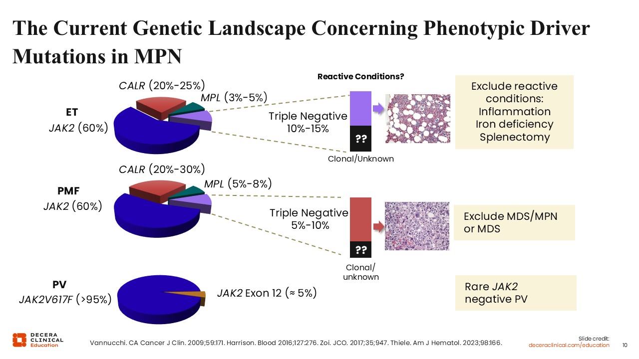 The breakdown of driver mutations in MF is similar to ET, and in cases of patients with triple-negative MF, other myeloid disorders such as myelodysplastic /myeloproliferative neoplasms (MDS/MPN) or myelodysplastic syndrome should be ruled out.4 Patients with triple-negative MF have historically poorer prognosis because their clonal drivers are often higher risk, and they can behave more similarly to MDS/MPN overlap biology.16