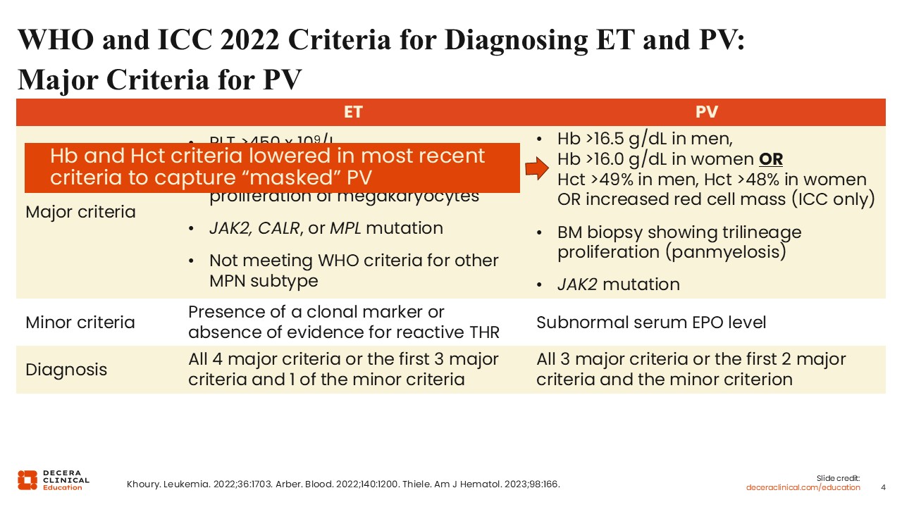 With regards to PV, major criteria include evidence for increased red blood cell parameters, including a hemoglobin >16.5 in men and >16 in women, or hematocrit >49% in men and >48% in women.1-3 Note that the current WHO criteria lowered the hemoglobin and hematocrit threshold in formal diagnostic criteria, in recognition that some patients with PV may not have significantly elevated red blood cell parameters.1,5 This “masked” PV is especially common in patients who present with Budd-Chiari syndrome, which is often accompanied by portal hypertension and splenomegaly.6,7 The resulting expanded plasma volume can dilute hemoglobin and hematocrit values, resulting in falsely low or “masked” phenotype. Other major criteria include characteristic bone marrow biopsy findings, more specifically panmyelosis as PV is characterized by myeloid, not just erythroid, expansion, and a JAK2 mutation, which occurs in nearly all patients with PV.