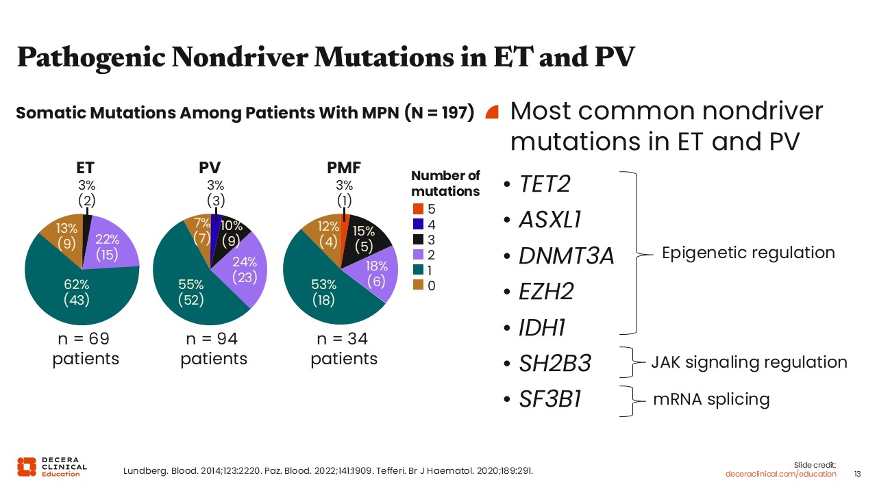 What is the role of genetic testing in ET and PV to identify concomitant nondriver mutations that occur? Unlike in MF where expert consensus guidelines recommend next-generation sequencing to evaluate for other nondriver mutations, the role of such testing in ET and PV is not yet clear given the lack of clinical utility of detecting these mutations at diagnosis.19 In MF, we have a plethora of scoring guidelines for prognosis that integrate molecular testing, and these results are critical for making management decisions such as transplantation.20-22 Given that there are generally fewer nondriver mutations present in ET and PV compared to MF, the evidence related to prognosis for many mutations is also less clear. However, as you can see from this 1 study, approximately 20% to 30% of patients with ET and PV will have other nondriver mutations.23 The most common mutations in ET and PV include mutations in TET2, ASXL1, and DNMT3A.