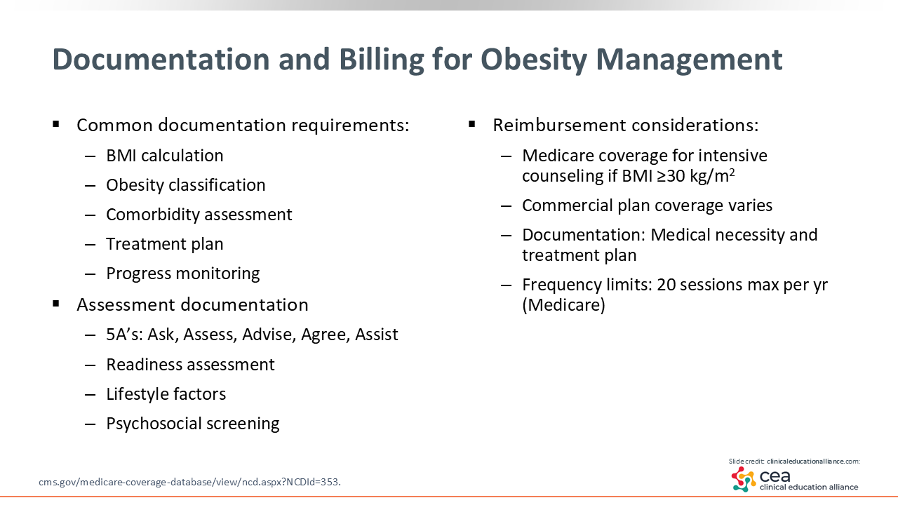 Specifically for Medicare, we must document the “5 A’s”: ask for permission, assess what is going on, advise patients about their treatment options, agree on a treatment plan, and assist them with follow-up as well as evaluating that plan. This includes assessing patients’ readiness, identifying the lifestyle modifications they have already tried, and screening for psychosocial concerns like depression and eating disorders.