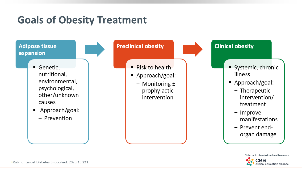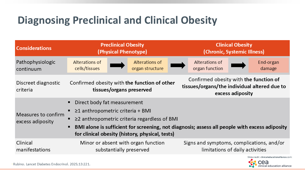 That being said, overwhelming numbers of organizations have endorsed Rubino and colleagues’ conclusions. Therefore, HCPs need to understand that the premise of this is to evaluate the complete presentation of patients with overweight or clinical obesity. In addition, HCPs should ensure they are identifying early presentation of this disease, metabolic derangements, impacts on quality of life, and where patients are at on the continuum of obesity.