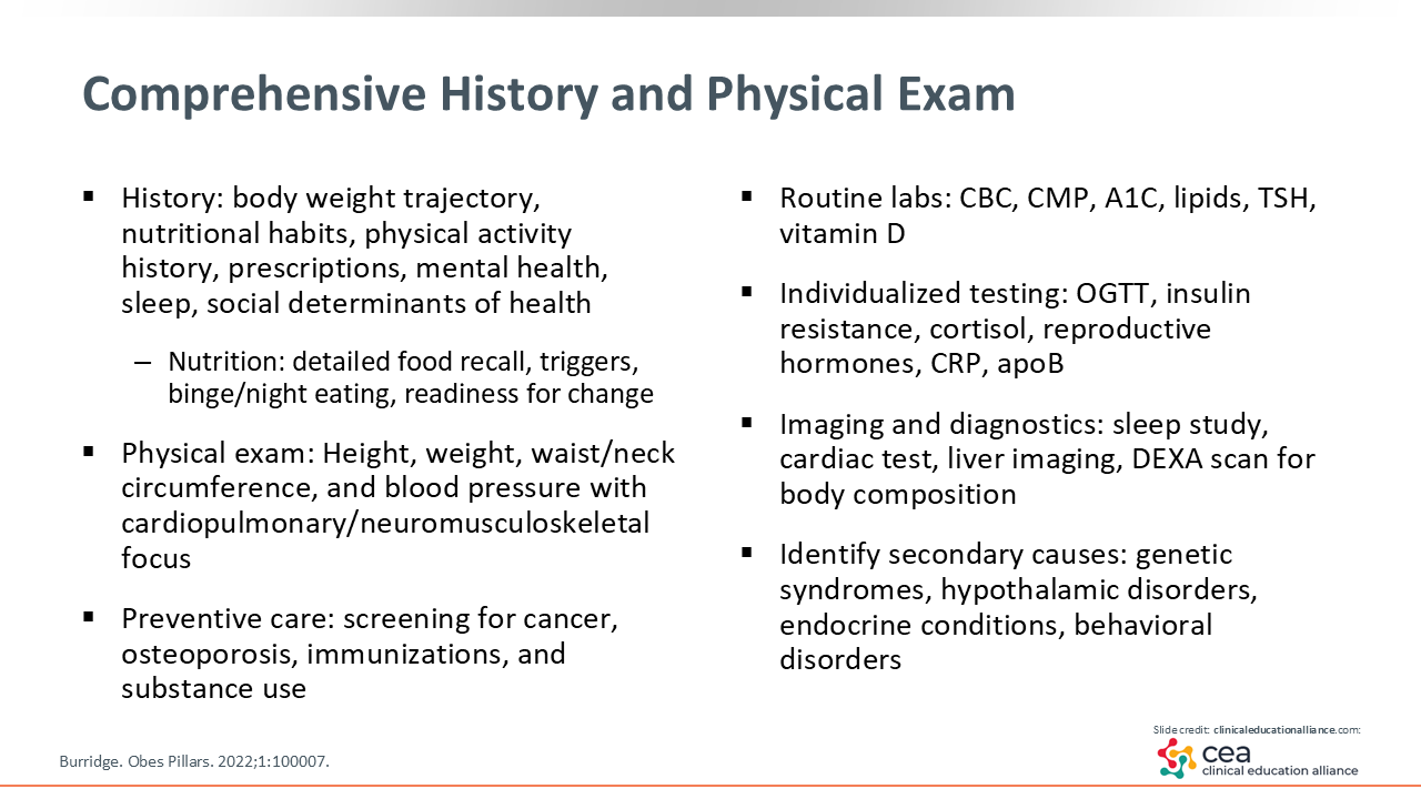 Upon determining the presence of obesity using these measures, HCPs should then assess if and how the excess adiposity is affecting patients. HCPs must determine what else could be going on with patients who are impacted by obesity. Therefore, getting a more comprehensive past medical history, physical examination, and some additional blood testing can be done.3,7