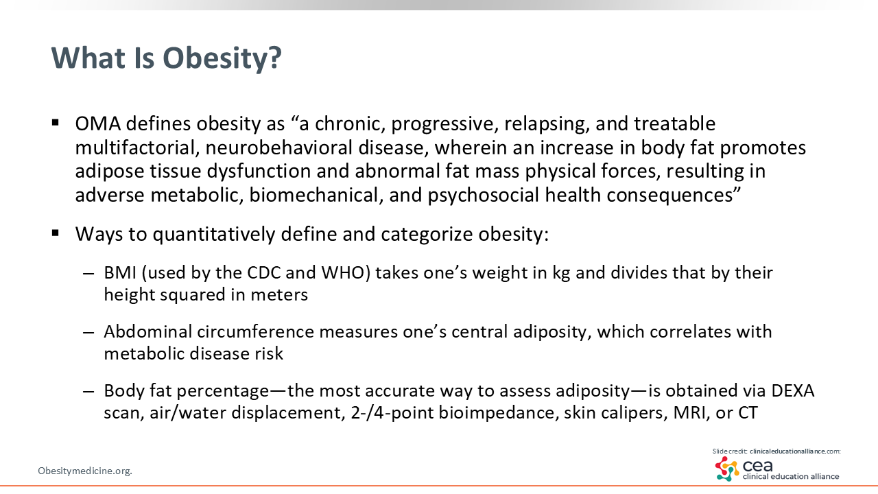 The Obesity Medicine Association (OMA) defines obesity as “a chronic, progressive, relapsing, and treatable multifactorial, neurobehavioral disease, wherein an increase of body fat promotes adipose tissue dysfunction and abnormal fat mass physical forces, resulting in adverse metabolic, biochemical, and psychosocial health consequences.”1 That is a very comprehensive and complex definition. And the disease of obesity is exactly that—comprehensive and complex.